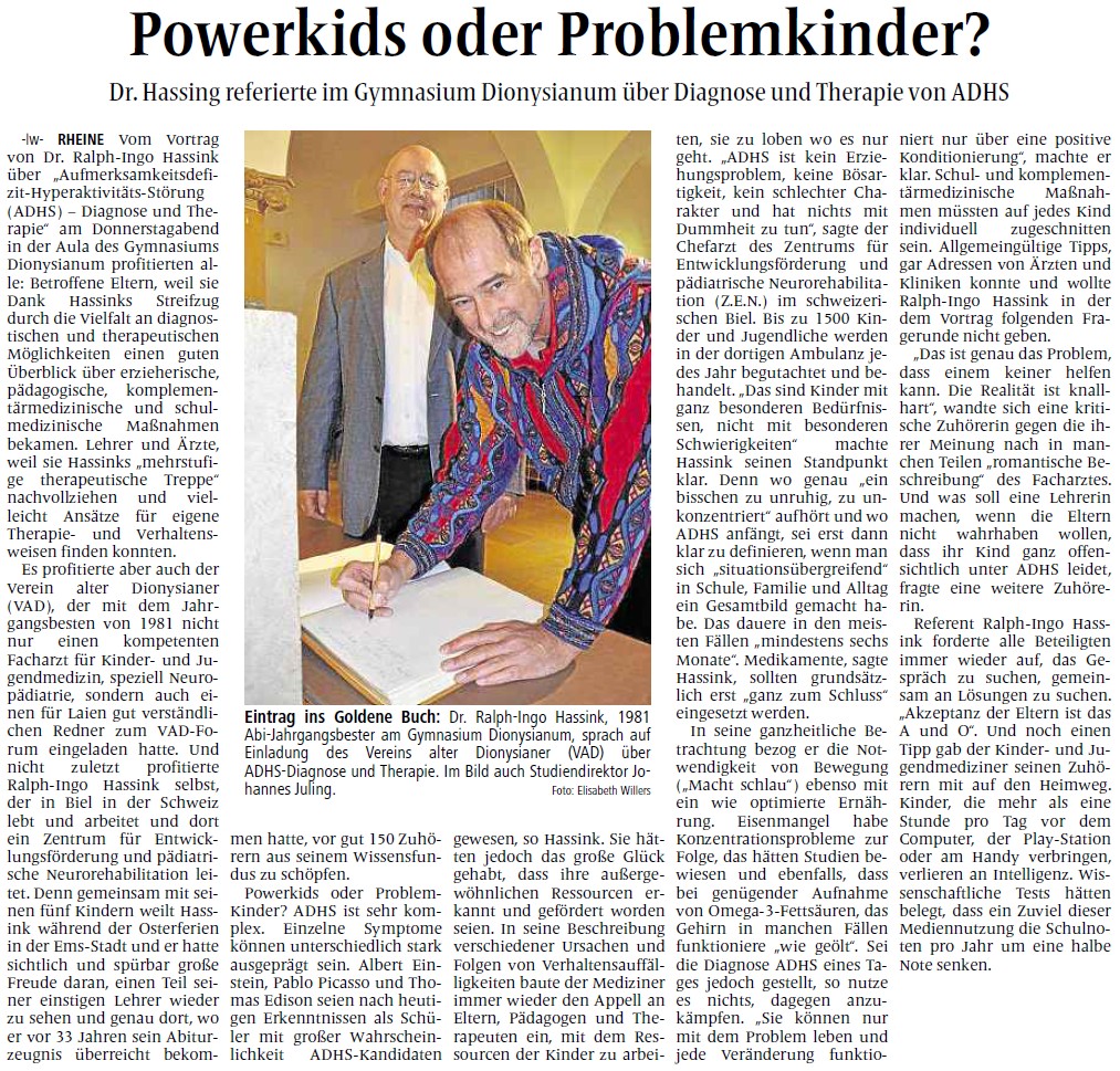 MV 12.04.2014 Forum Dionysianum - ADHS Verfasst am 12. April 2014. Anhänge: 2014-04-12 MV ADHS - Powerkids oder Problemkinder.jpg[ ]472 kB HASSINK - Vortrag_ueber_ADHS.pdf[ ]1120 kB Zurück Weiter